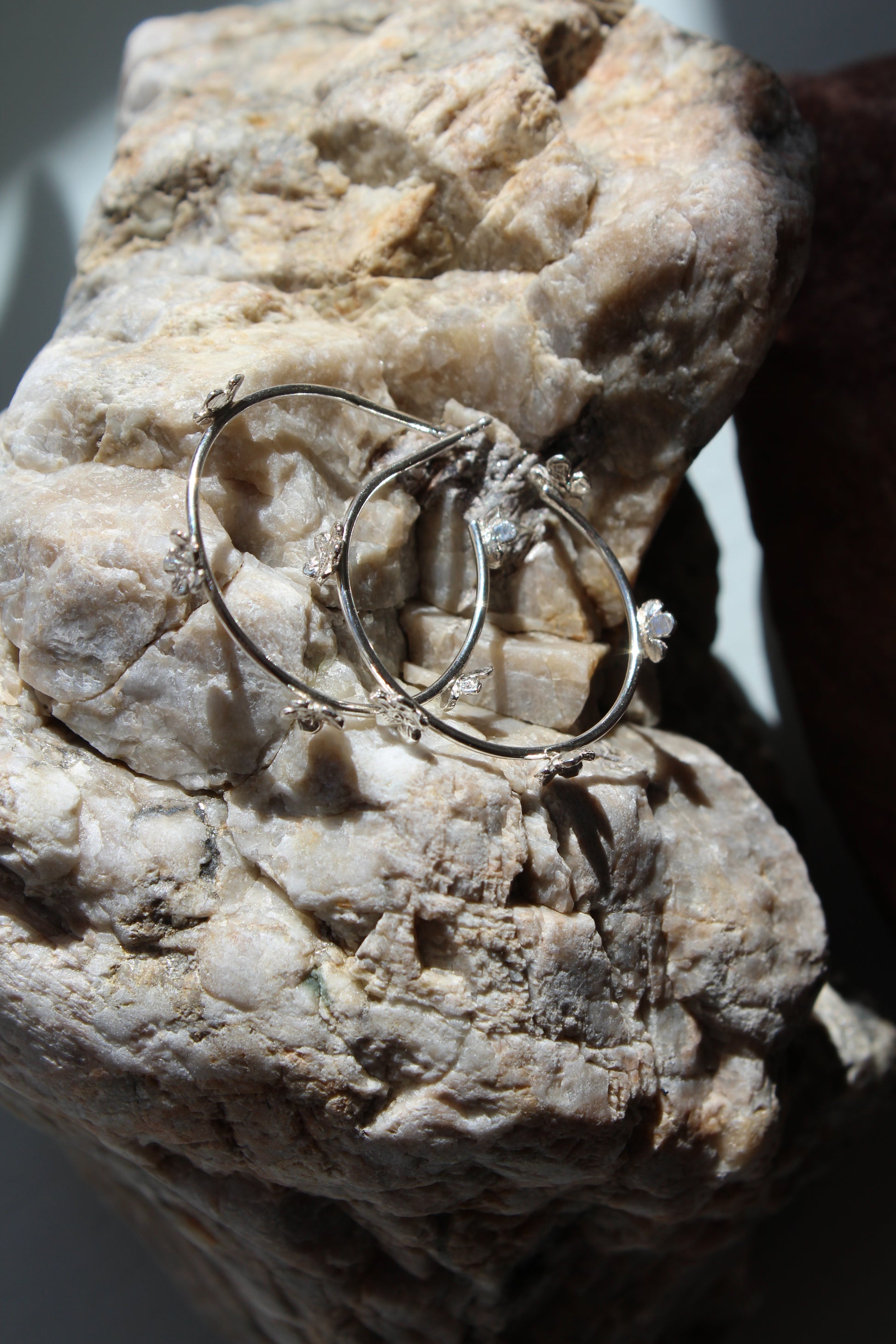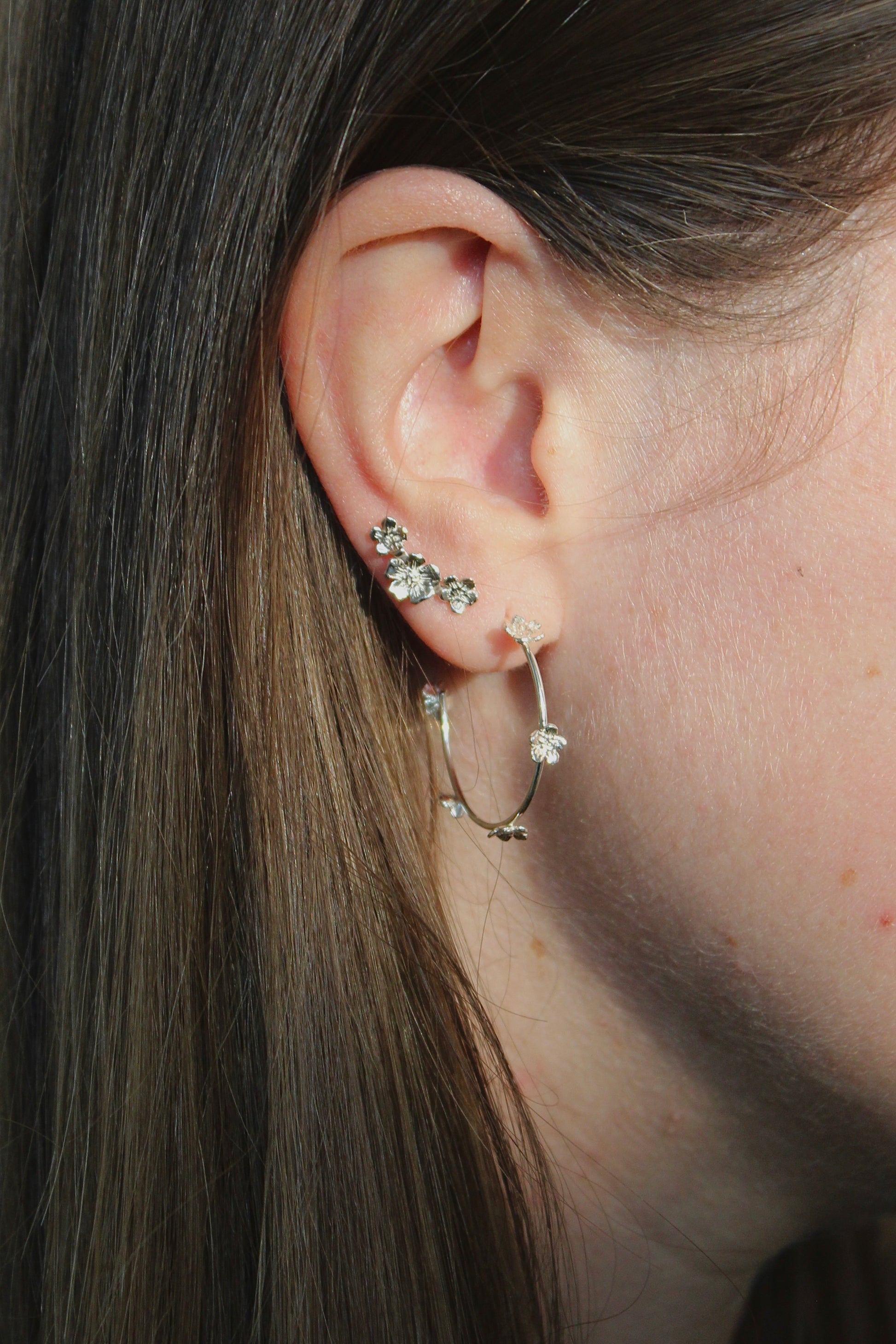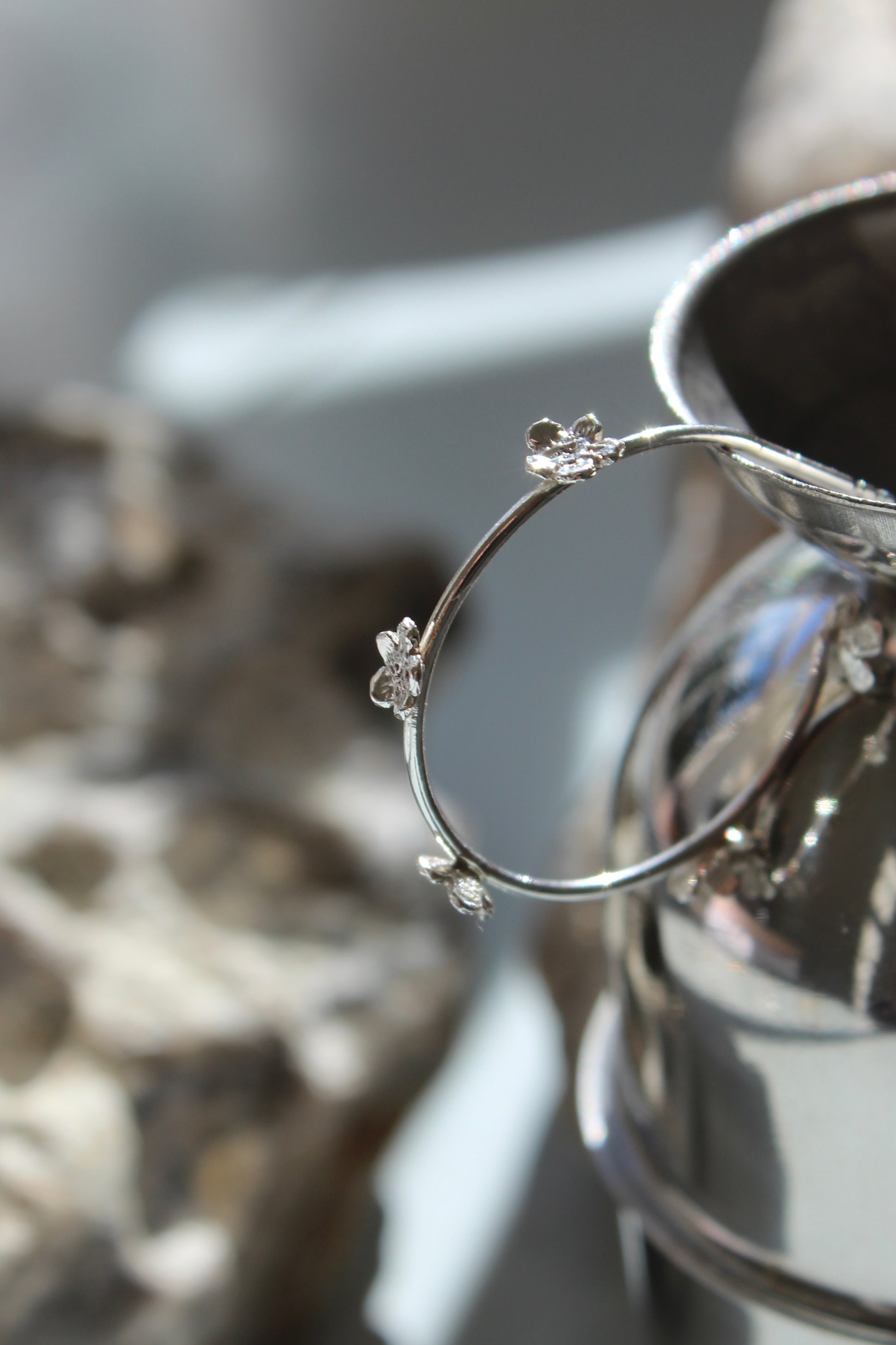 Fleur De Cerise creolerne har et elegant og legende udtryk. De små blomster, der er placeret rundt på ringen, giver et let og naturligt spil, som fanger lyset og tilføjer et strejf af romantik. Resultatet er et par creoler, der føles både klassiske og særlige – perfekte til både hverdag og fest.
