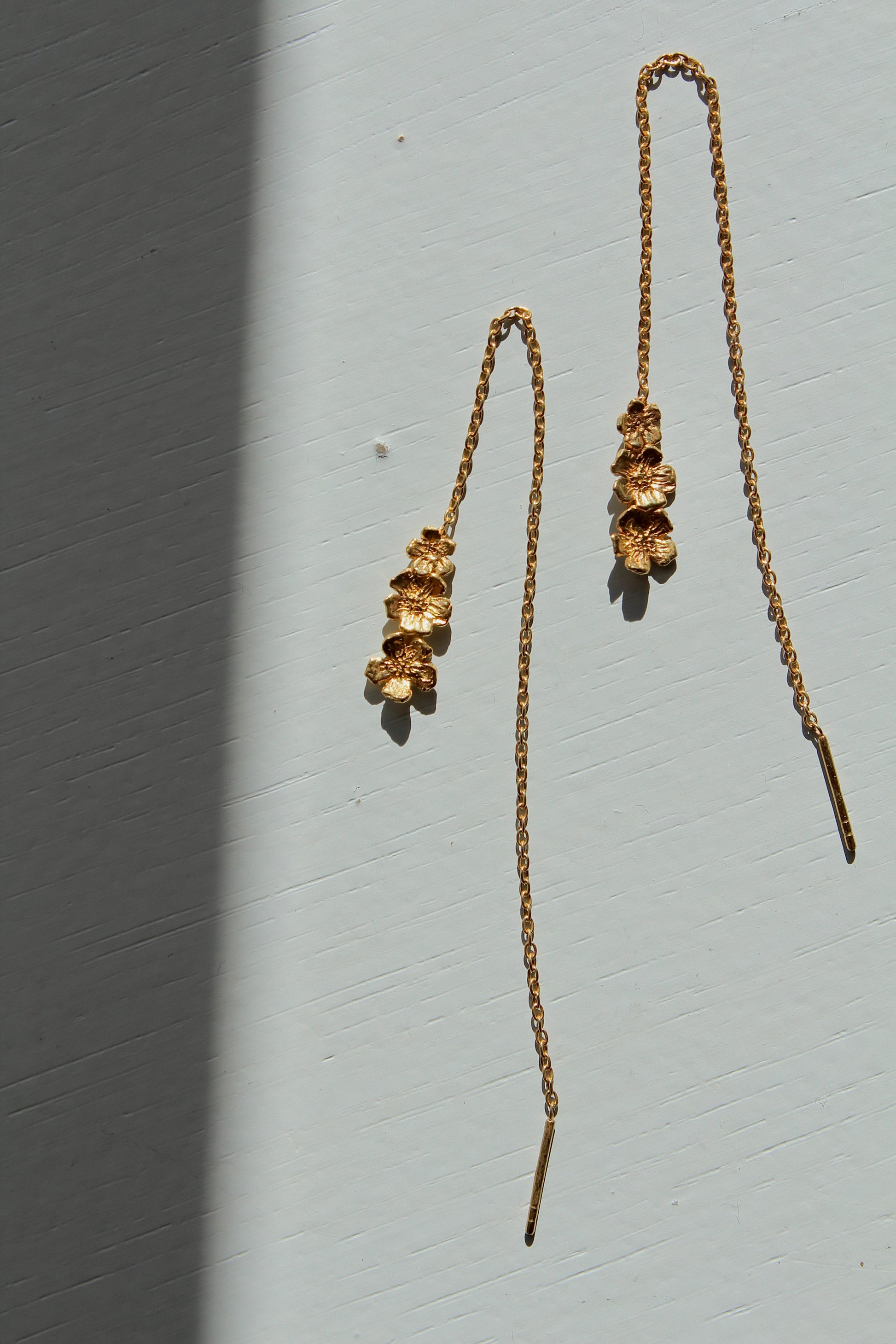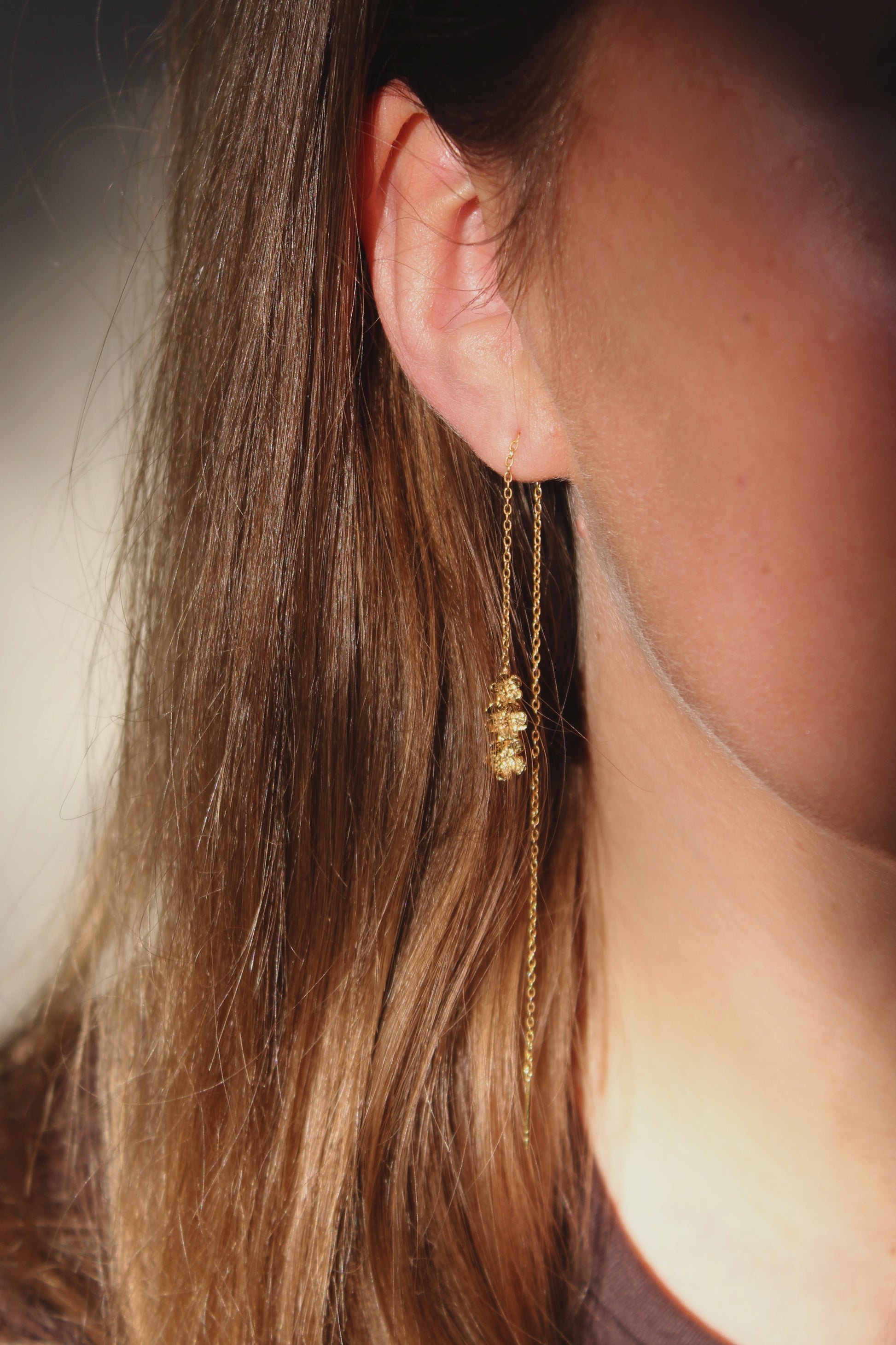 Fleur De Cerise kædeøreringen har et let og elegant udtryk. I enden af den fine kæde hænger tre små blomster, der bevæger sig smukt med lyset og giver et feminint og romantisk præg. Øreringen trækkes nemt gennem øret og kan placeres, så den passer præcis til dit udtryk – enkel, legende og helt personlig.